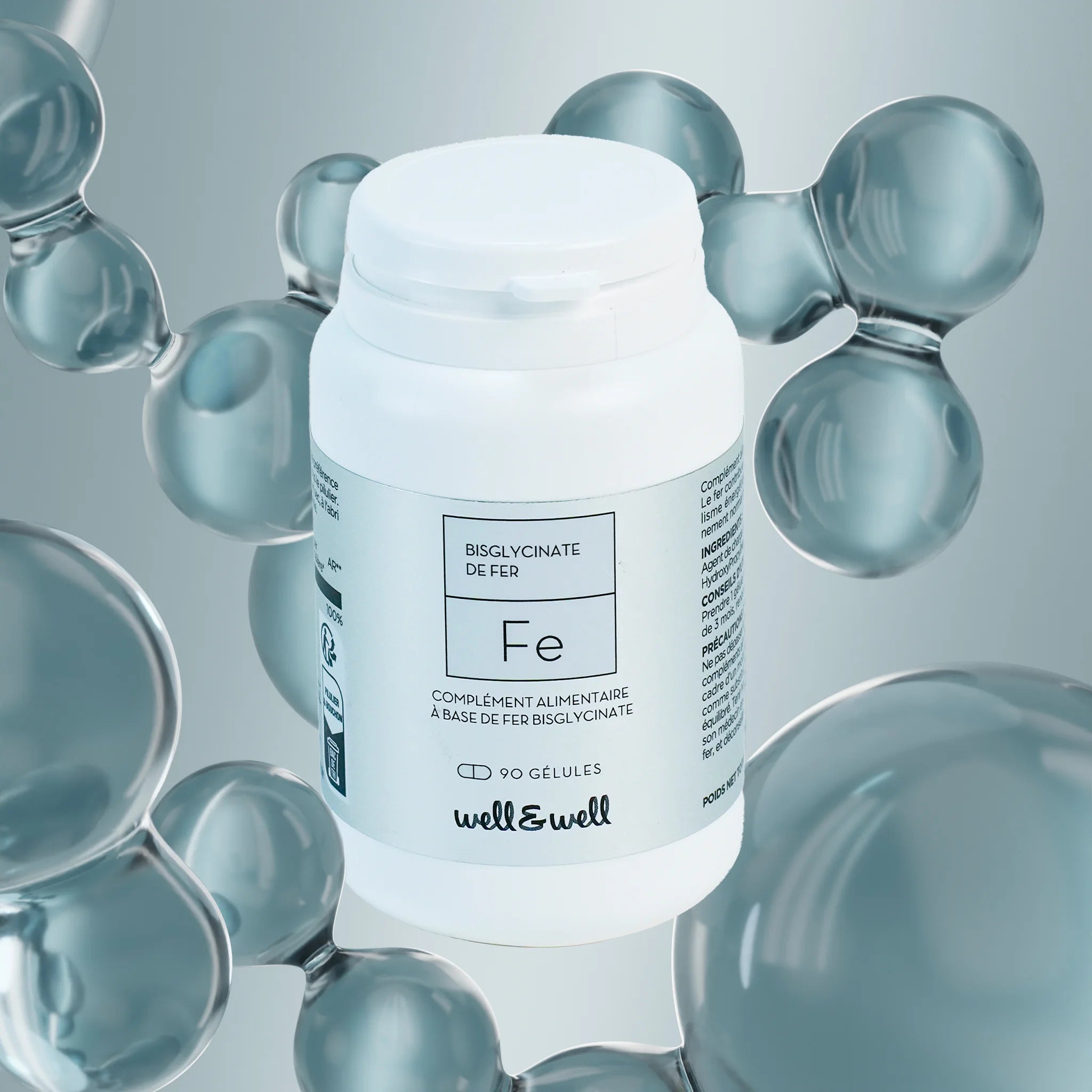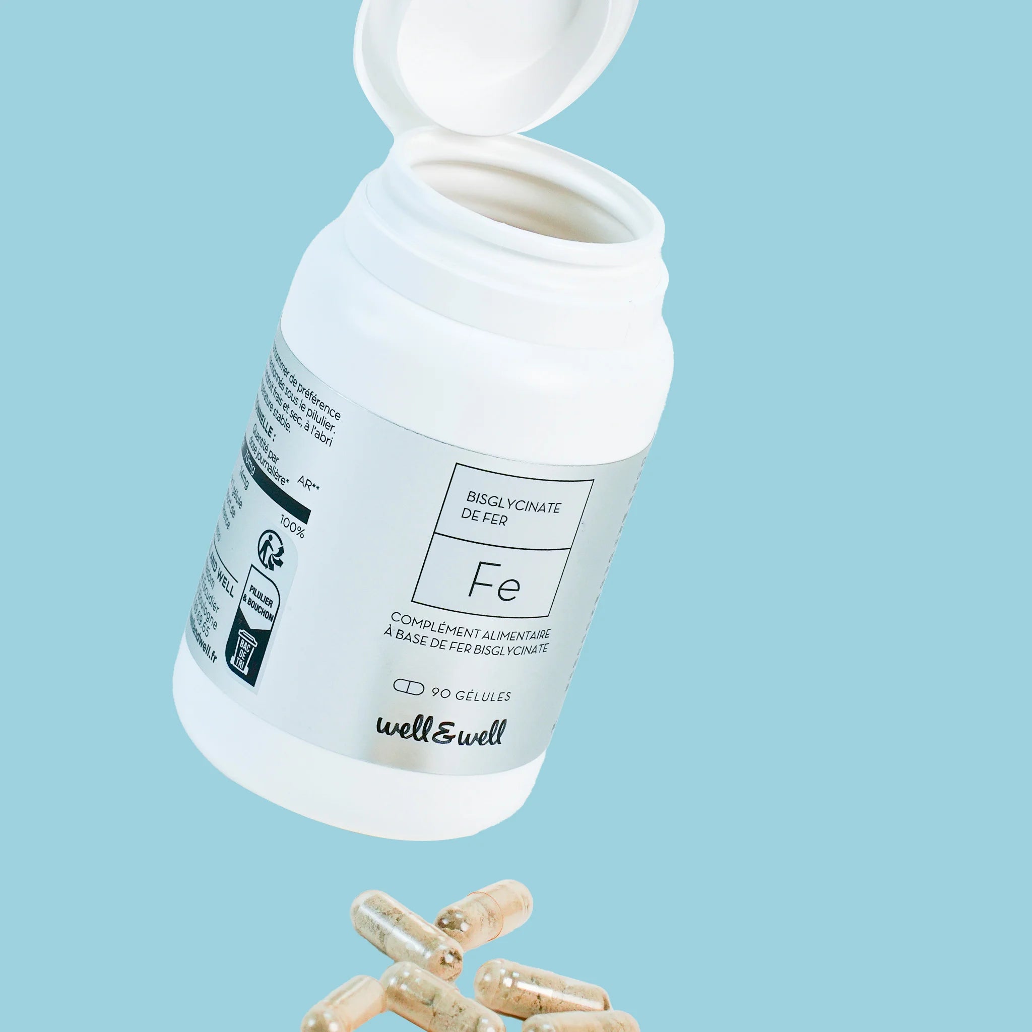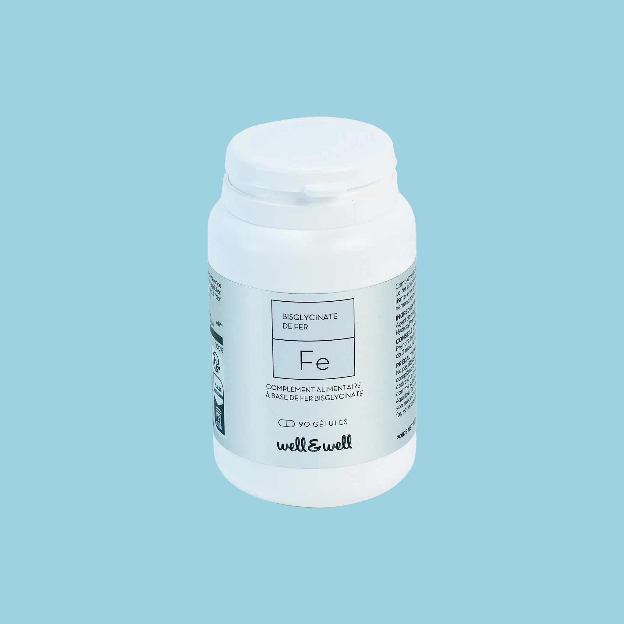 Le fer est présent dans nos globules rouges et sert à véhiculer l’oxygène dans nos muscles. C’est pourquoi un déficit en fer (présent dans beaucoup de réactions métaboliques) provoque anémie, baisse des performances physiques et intellectuelles et sensibilité aux infections. Il est important de faire un dosage de sa ferritine (examen sanguin) afin d’évaluer ses réserves en fer dans l’organisme.Tout comme pour le magnésium Mg de chez Well&Well, le bisglycinate de fer est une forme hautement assimilée et tolérée par l’organisme.